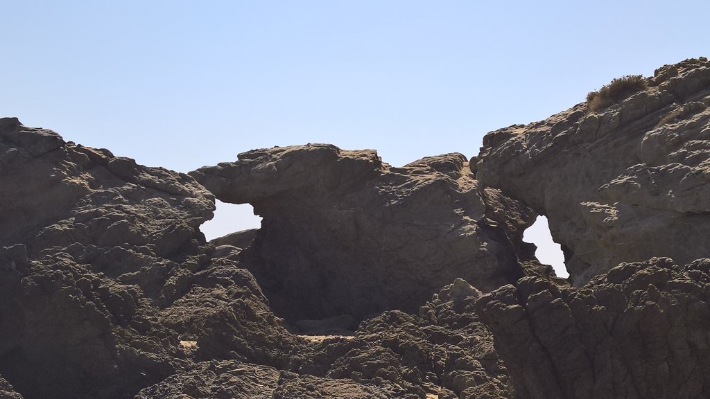 Photograph taken from the beach, with the camera aimed high to the top of this boulder formation!